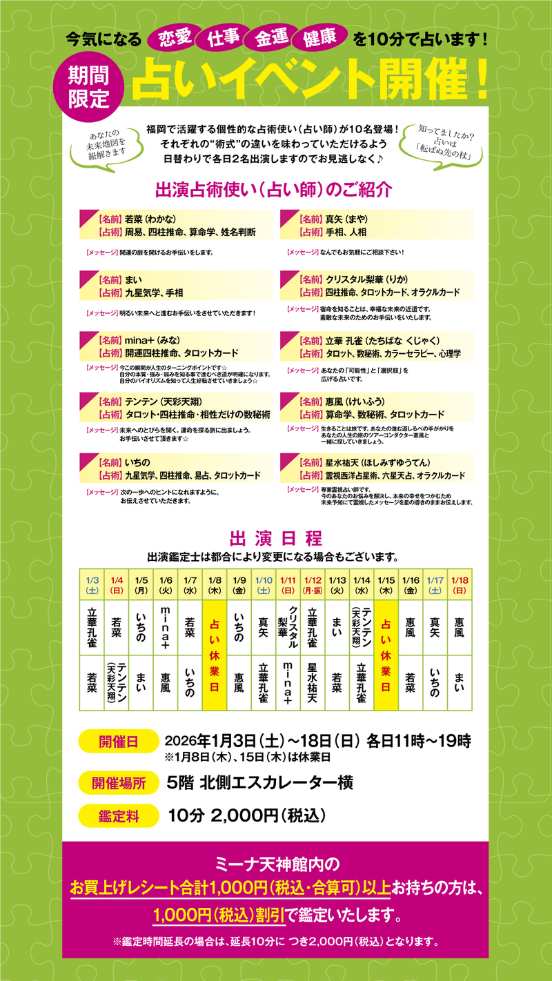 HOME > minaニュース > イベントニュース > 『期間限定占いイベント開催!』1月3日(土)~1月18日(日)