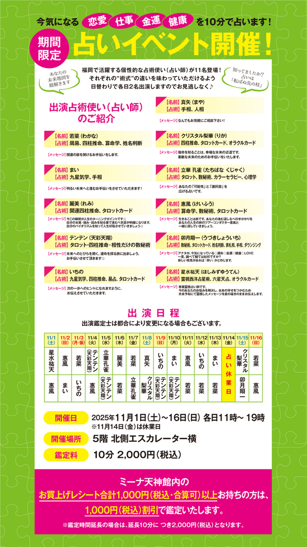 HOME > minaニュース > イベントニュース > 『期間限定占いイベント開催!』11月1日(土)~11月16日(日)
