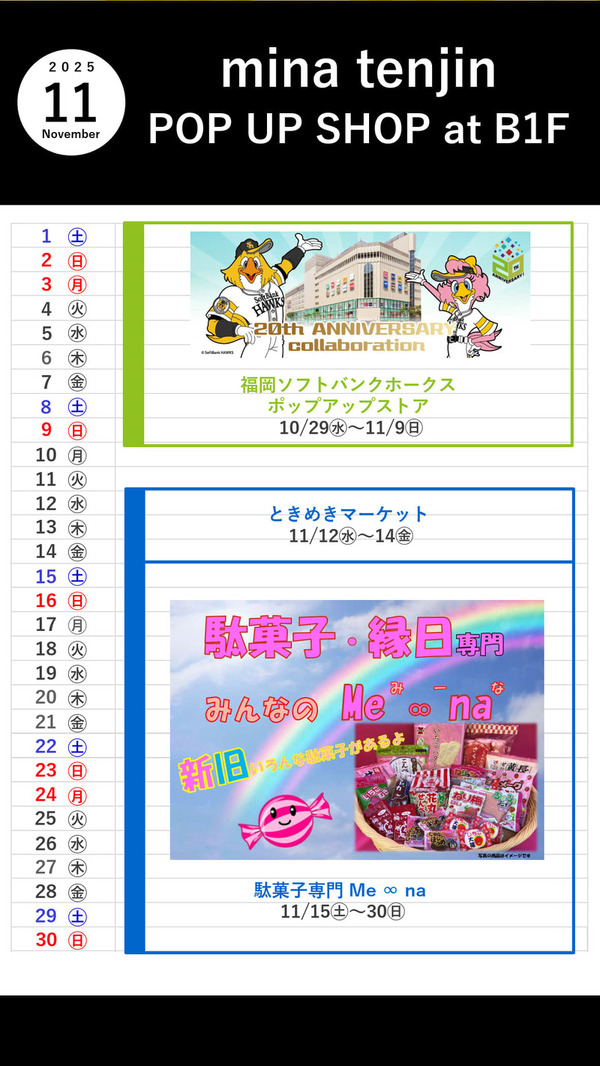 HOME > minaニュース > イベントニュース > 『POP UP SHOP at B1F』11月カレンダー
