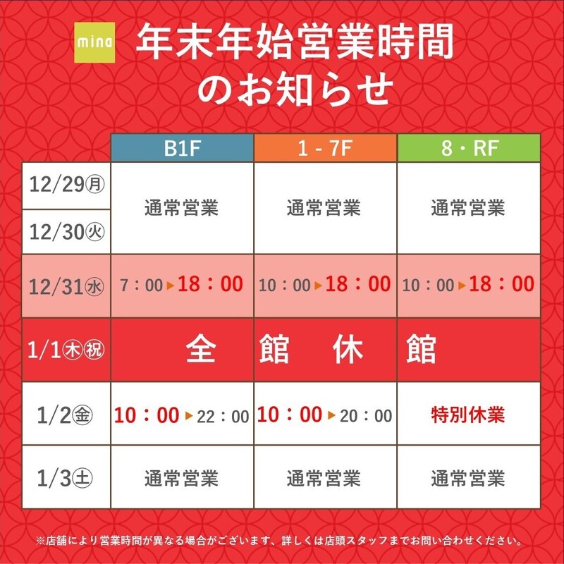 HOME > minaニュース > イベントニュース > 年末年始営業時間のお知らせ
