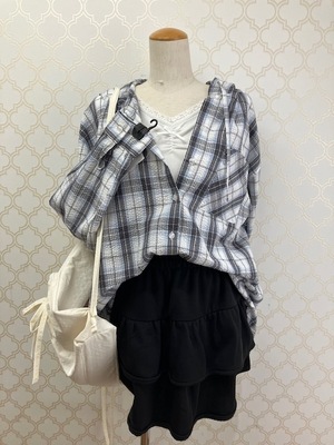 ヒップまですっぽり隠れる丈感のゆったりシャツにフードを付けた、トレンド感たっぷりなデザイン。
